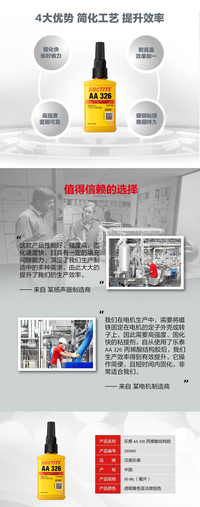 樂(lè)泰AA326丙烯酸結(jié)構(gòu)膠粘稠度適中(觸變),無(wú)需混合,適用于磁鋼及金屬部件粘接。樂(lè)泰AA326丙烯酸結(jié)構(gòu)膠僅需3分鐘即可快速固化,節(jié)省工時(shí)。樂(lè)泰AA326丙烯酸結(jié)構(gòu)膠在120℃高溫工況下效果如一,且具備高強(qiáng)度特點(diǎn)。樂(lè)泰AA326丙烯酸結(jié)構(gòu)膠主要用于將鐵氧體粘接到要求快速固定的電機(jī)定子或轉(zhuǎn)子上,也可用于揚(yáng)聲器零件和珠寶。